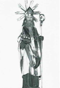 In unserer Pfarrkirche ist er dargestellt im Bischofsornat mit drei goldenen Kugeln auf dem Buch — ein Hinweis wohl auf sein entschiedenes Eintreten für die Wesensgleichheit der drei göttlichen Personen auf dem Konzil von Nicäa.